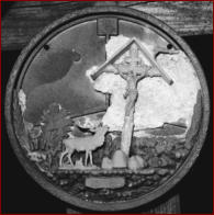 auf. Das rechts abgebildete Medaillon mit der Darstellung eines Hirschen vor einem Wegkreuz